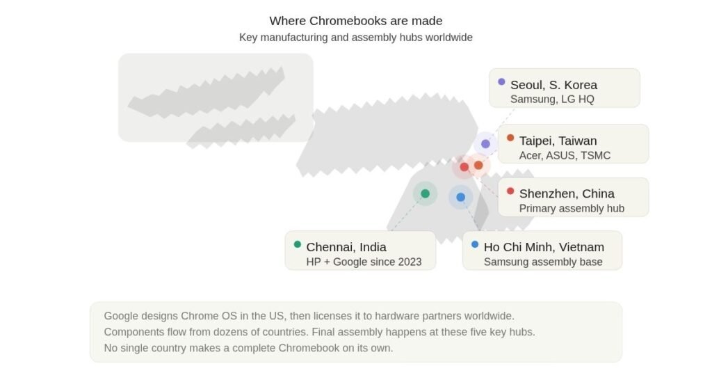 Taiwan plays a huge role in the Chromebook world. Acer and ASUS are both Taiwanese companies. TSMC, the world’s largest chip foundry, is based in Taiwan. So even if a Chromebook says “Assembled in China,” key components may have been designed or fabricated in Taiwan, South Korea, Japan, or the US.