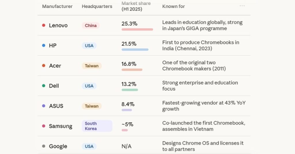 Chromebook Market Share by Manufacturer (H1 2025)